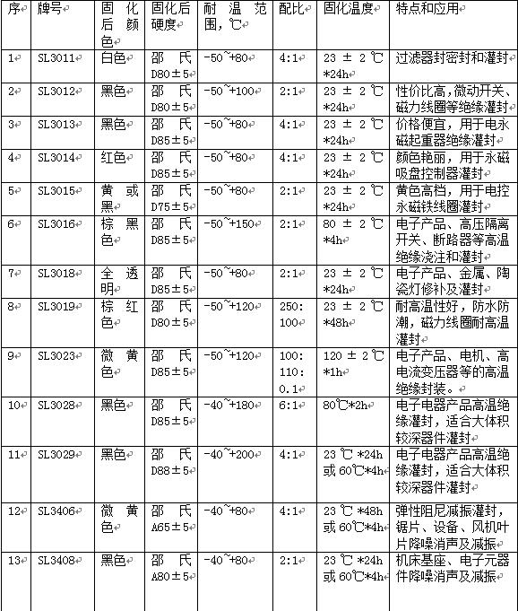 通過(guò)上表我們對(duì)于絕緣灌封膠的有了初步的了解,所以在做灌封膠的選擇時(shí)就會(huì)更懂得如何分辨,也知道耐溫等級(jí),以及固化后的硬度是關(guān)鍵,另外還要根據(jù)每個(gè)工廠實(shí)際的可以固化的操作工藝來(lái)選擇,如果不清楚也可以直接與世林的工程技術(shù)人員咨詢:0731-28612221。