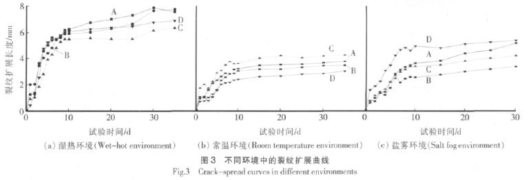 依次為 D>A>B>C; 常溫環(huán)境中,種規(guī)格膠粘劑的裂紋擴(kuò)展由快到慢依次為 C>A>B>D 鹽霧環(huán)境中,種規(guī)格膠粘劑的裂紋擴(kuò)展由快到慢依次為 D>A>C>B。