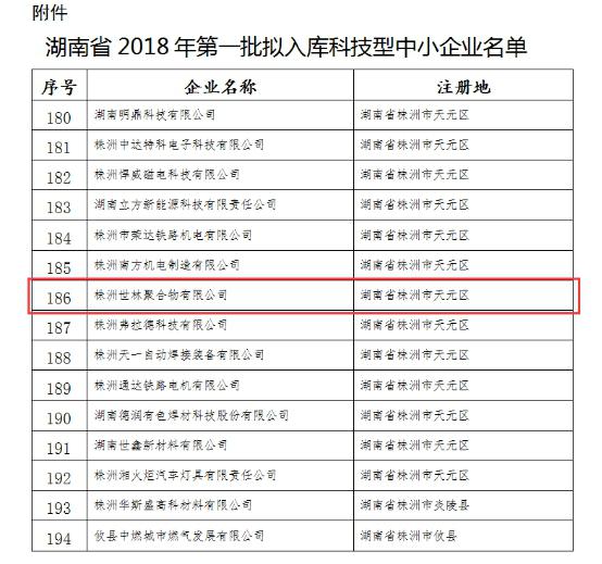 根據(jù)《科技型中小企業(yè)評(píng)價(jià)辦法》(國科發(fā)政〔2017〕115號(hào))和《科技型中小企業(yè)評(píng)價(jià)工作指引(試行)》(國科火字〔2017〕144號(hào))有關(guān)規(guī)定,經(jīng)企業(yè)自主評(píng)價(jià)、評(píng)價(jià)機(jī)構(gòu)審核,現(xiàn)將湖南省2018年批194家擬入庫科技型中小企業(yè)名單(名單見附件)予以公示,株洲世林聚合物有限公司(世林膠業(yè))也榮獲在內(nèi)。